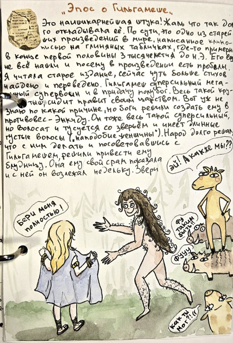 Это наишикарнейшая штука! Жаль что так долго откладывала её. По сути, это одно из старейших произведений в мире, написанное клинописью на глиняных табличках, где-то примерно в конце первой половины 3 тысячелетия до Н.Э. Его ещё не всё нашли и посему в произведении есть пробелы. Я читала старое издание, сейчас чуть больше стихов найдено и переведено. Гильгамеш суперсильный мегаумный супервоин и в придачу полубог. Весь такой крутыш, сидит правит своим царством. Вот уж не знаю по какой причине, но боги решили создать ему в противовес- Энкиду. Он тоже весь такой суперсильный, но волосат и тусуется со зверьём и имеет длинные густые волосы («наподобие женщины»). Народ долго решали, что с ним делать и посоветовавшись с Гильгамешем, решили привести ему блудницу. Она ему свой срам показала и с ней он возлежал недельку. Звери на это разобиделись, а сам он потерял силу в ногах и понял, что не сможет больше со зверьём бегать. Решил тогда Энкиду пойти в город к Гильгамешу. Тот же видит сон, что сил