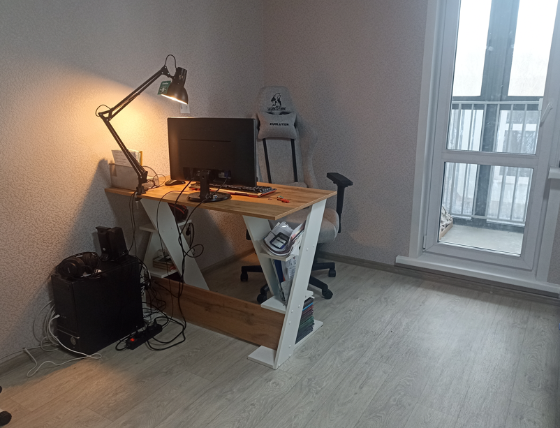 Вот с проводами пока всё так себе, но это временно. За рабочим столом должен стоять небольшой диван для отдыха или гостей. Пока его нет, провода в свободном полёте, позже планирую всё облагородить.