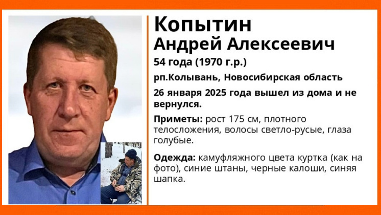 В рабочем поселке Колывань Новосибирской области без вести пропал 54-летний Андрей Копытин. Как сообщили в поисково-спасательном отряде (ПСО) «ЛизаАлерт», с 26 января 2025 года его местонахождение неизвестно, мужчина вышел из дома и не вернулся, к поискам подключились волонтеры. Приметы пропавшего: рост 175 сантиметров, плотного телосложения, волосы светло-русые, глаза голубые. В день исчезновения мужчина был одет в куртку камуфляжного цвета, синие штаны, черные калоши и синюю шапку. Если у вас есть информация о местонахождении Андрея Копытина, сообщите об этом по телефону ПСО 8-800-700-54-52 или наберите 112. Ранее «Вести Новосибирск» писали, что в Бердске без вести пропал 47-летний лысый мужчина со шрамом над губой.