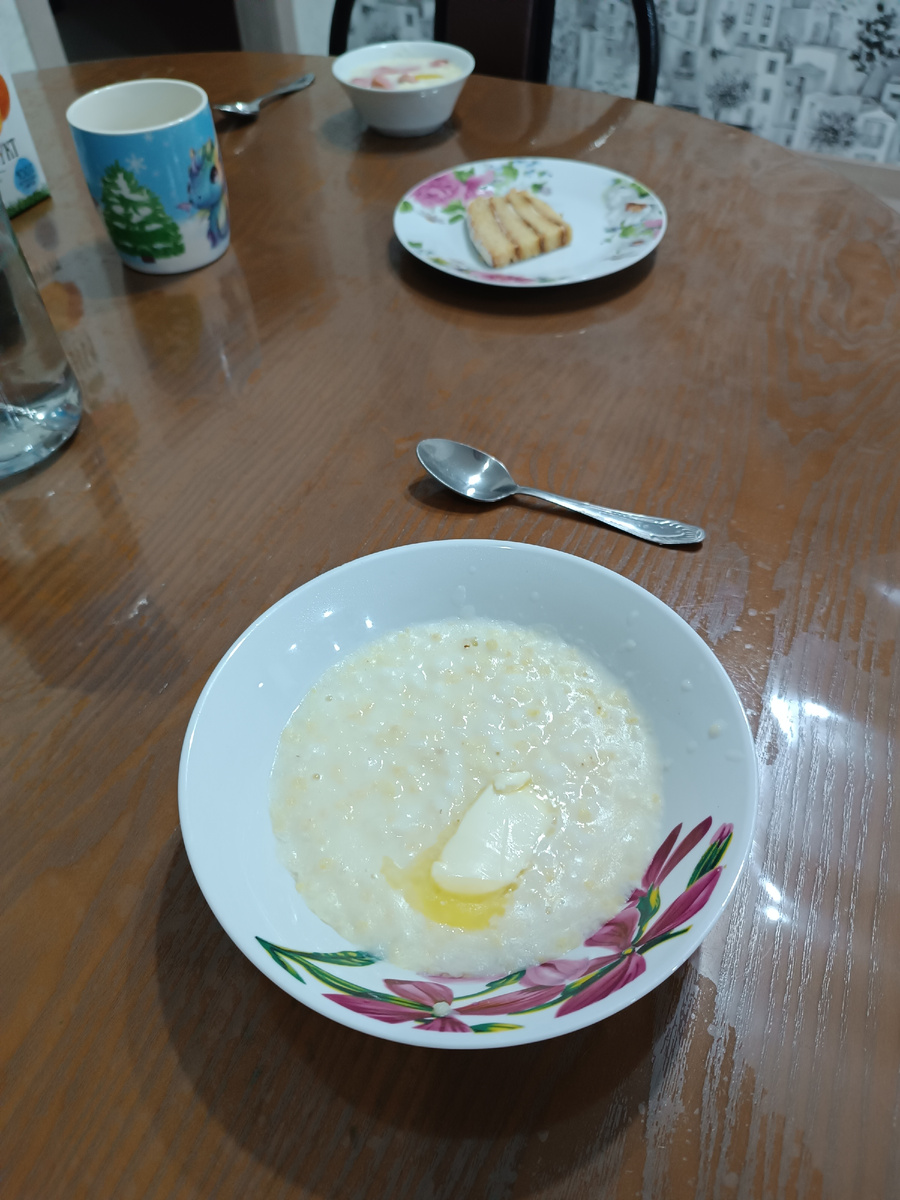 А дальше отточенными движениями берусь за человеческий завтрак) Каша "дружба" сварена вчера накануне, а сегодня я только раскладываю еë по тарелочкам.
