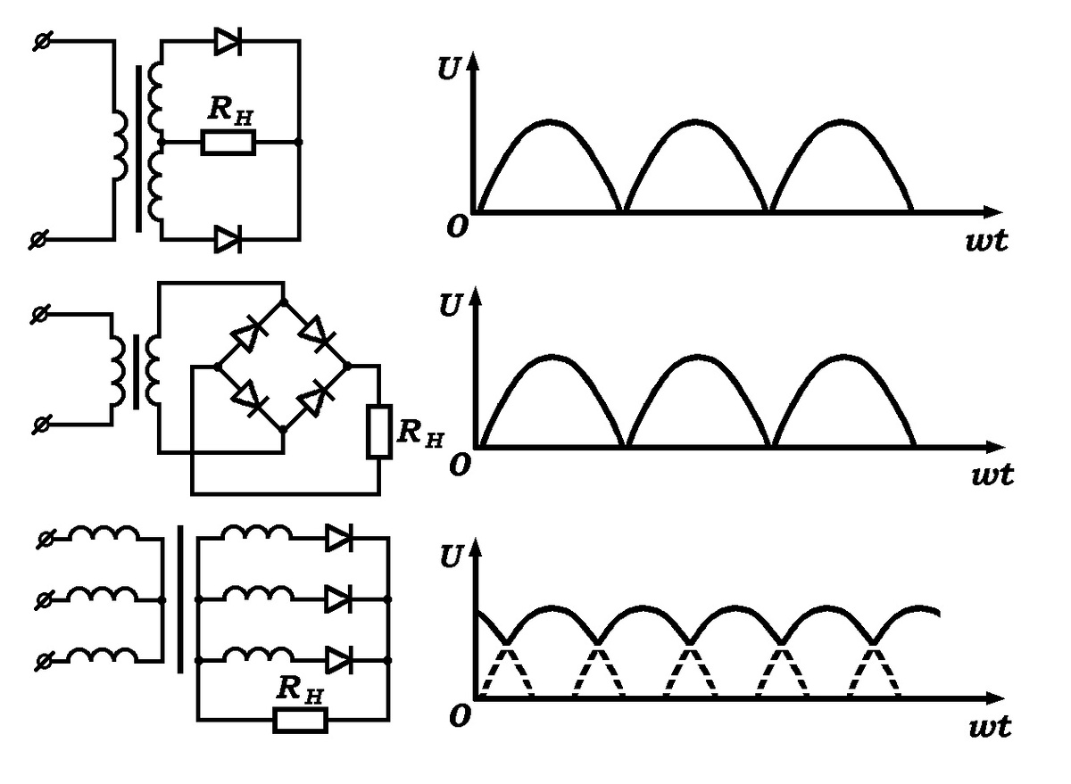 Схем выпрямителей трехфазного напряжения много, нам же в основном приходится встречаться со схемами питания РЭА от однофазной сети переменного тока 220 В.