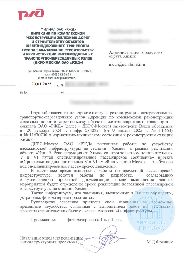 В 2024 году станцией "Химки" никто особо не занимался. Из ответа РЖД я узнала причину: ДКРС-Москва OAO «РЖД» выполняет работы по устройству пассажирской инфраструктуры на станции Химки в рамках реализации объекта «Этап 5. Реконструкция ст. Химки со строительством дополнительных V и VI путей специализированное пассажирское сообщение» проекта «Строительство дополнительных V и VI путей на участке Москва — Алабушево под специализированное пассажирское движение». В настоящее время выполнены работы по временной пассажирской инфраструктуре, ведутся работы по разработке, согласованию и утверждению проектной документации, после выполнения данных мероприятий будут определены сроки реализации постоянной пассажирской инфраструктуры на станции Химки. Специализированное пассажирское сообщение — это транспортное сообщение, для которого предусмотрены специальные железнодорожные пути и транспортные средства. Как могли заметить жители Химок, в 2024 году на пересечении с каналом имени Москвы был устан
