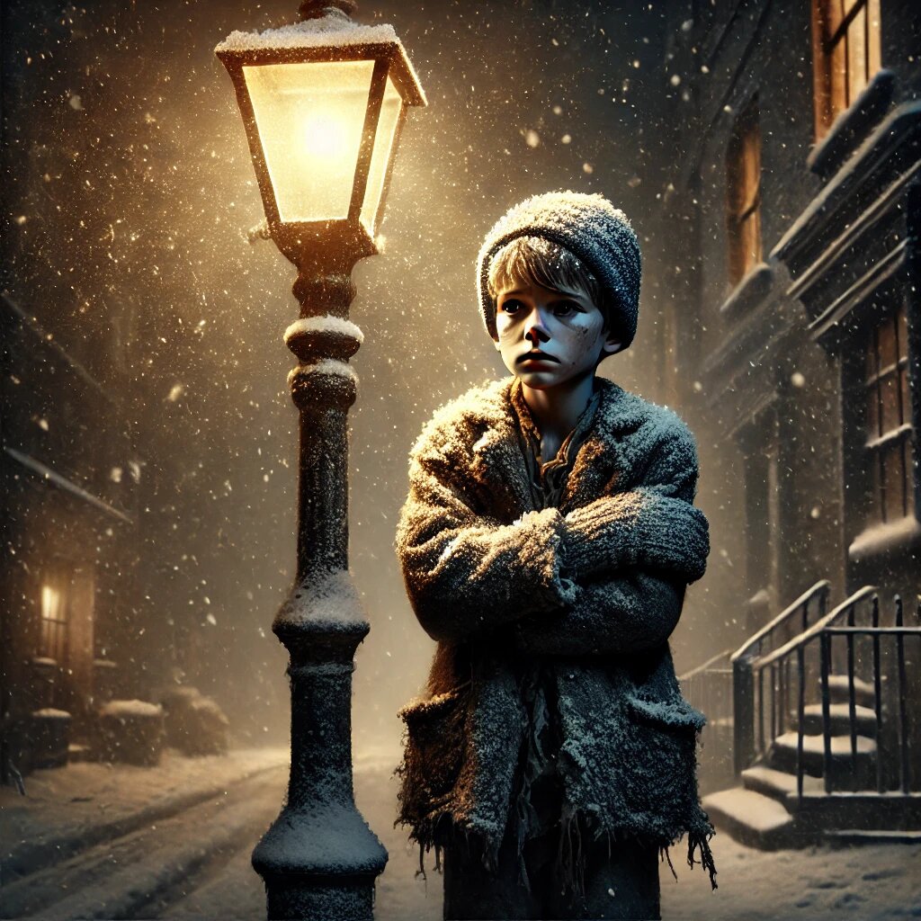 Когда они подошли ближе, мальчик поднял голову. Его лицо было красным от холода, а глаза блестели, будто он только что плакал. Он вытер нос рукавом, оставляя на нём мокрый след, и тихо заговорил: