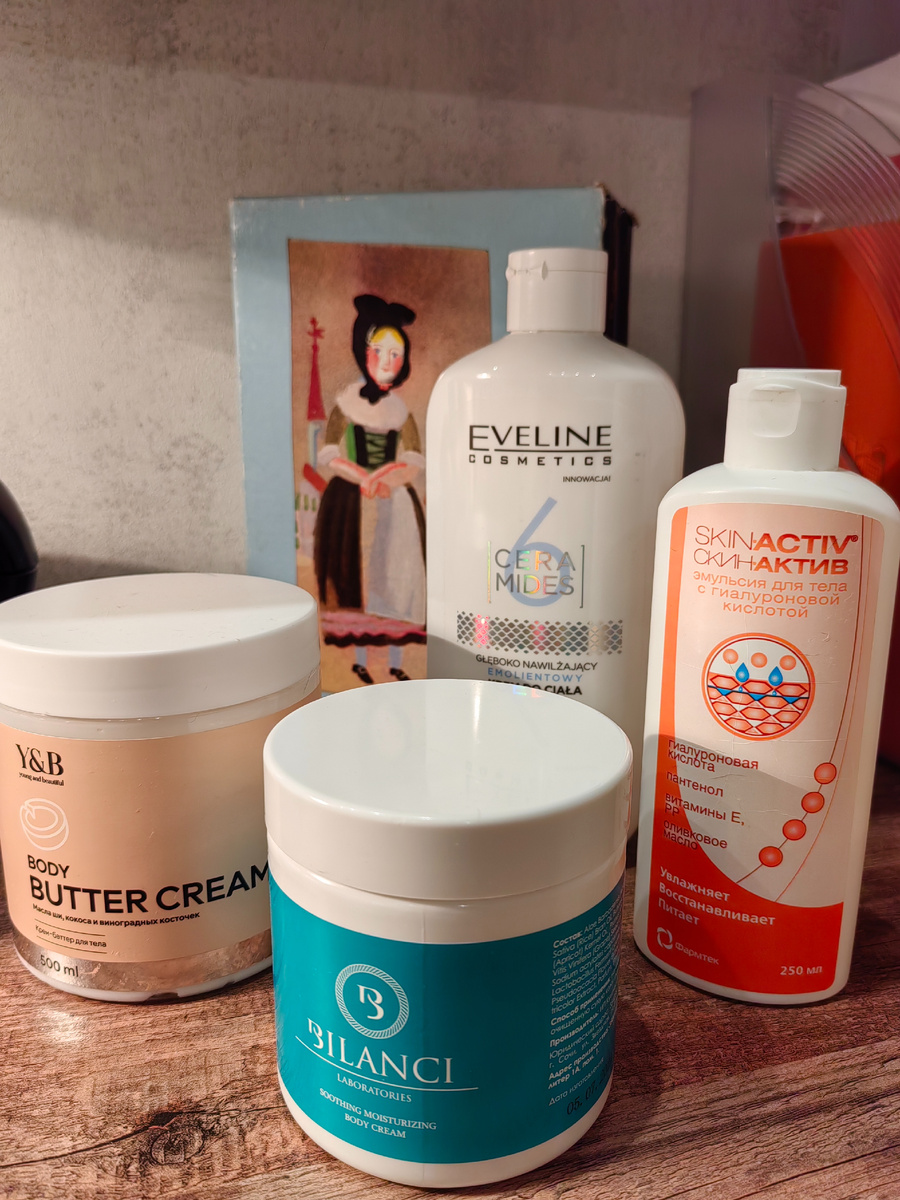 Получила на днях заказ на ВБ: набор тканевых масок и очередной кремик для тела. Кремик очередной – примерно тридцать седьмой по счёту)) – потому что без них я, увы, жить не могу: с детства очень сухая кожа. Ну и, кроме того, я посещаю бассейн, поэтому всяческие "мазилки" для тела (кремы, эмульсии, баттеры) уходят тоннами. Свой идеал пока не нашла, но я не отчаиваюсь. На сегодняшний момент в моей ванной, спальне и спортивной сумке живёт вот эта команда: