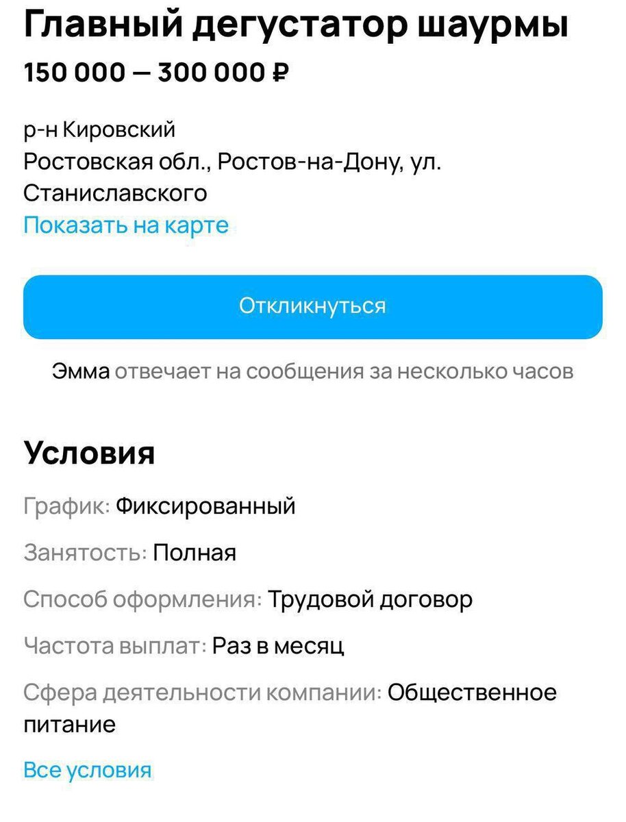 В Ростове-на-Дону открыта вакансия дегустатора шаурмы с зарплатой 300 тысяч рублей в месяц Кандидату потребуется не только безграничная любовь к шаурме, но и готовность к командировкам по России и Казахстану. Работодатель проявляет заботу о здоровье - дегустатору обеспечены регулярные визиты к гастроэнтерологу