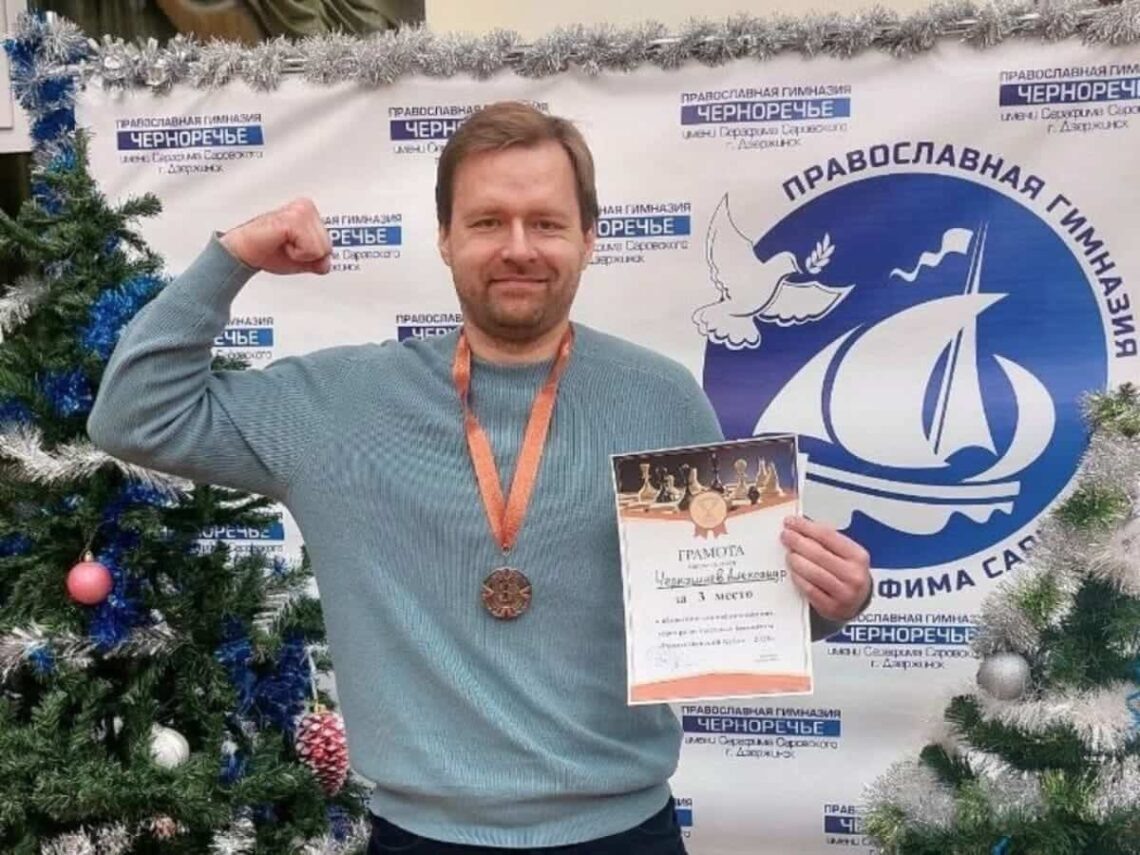 Известный дзержинский футболист, мастер спорта России по футболу Александр Черкашнев завоевал бронзовую медаль регионального турнира по быстрым шахматам «Рождественский кубок–2025». Соревнования прошли на базе дзержинской Православной гимназии и собрали около 80 шахматистов из Дзержинска, Нижнего Новгорода и других городов области. Возраст участников: от 7 до 74 лет. Александр Черкашнев сделал себе имя в дзержинском «Химике», в котором провел восемь сезонов и не раз становился лучшим бомбардиром. В 2007 году вместе с партнерами по ФК «Химик» выиграл звание победителя первенства России среди любительских клубов страны. Выступал также в областных командах – ФК «Семенов», богородский «Спартак», дубль «Химика». В последнее время играл в футбол в первенстве Дзержинска – за ТД «Эра» (большой футбол) и за «Корунд», «Мегатакт» (8 на 8). В прошлом году в составе «Мегатакта» стал бронзовым призером чемпионата РФЛ. С 2018 года Александр Черкашнев принимает участие в шахматных турнирах, но выше пя