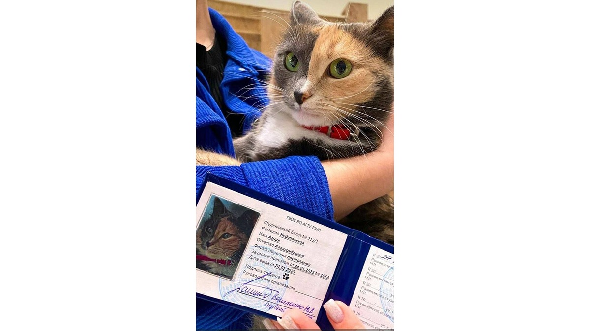 Ранее мы рассказывали о зачислении в ряды студентов лабрадора по кличке Снежок и овчарки по кличке Дункель. И вот наконец среди учащихся вуза появилась и кошка. Пушистой студенткой стала обворожительная кошка по кличке Агния. А точнее — Нефтянская Агния Александровна. Ректор АГТУ «Высшая школы нефти» торжественно вручил питомцу билет в День студента. Руководители ВШН отметили, что выдача документа — это не просто забавная акция. Таким образом университет признал особый вклад пушистой студентки в жизнь учебного заведения и ее активное участие в образовательном процессе. Кошка появилась на территории вуза еще во время строительства учебно-лабораторного корпуса. Примечательно, для Агнии придумали особую форму обучения. Пока все обучающиеся проходят очную или заочную программу, питомец принят в университет на постоянную форму обучения.