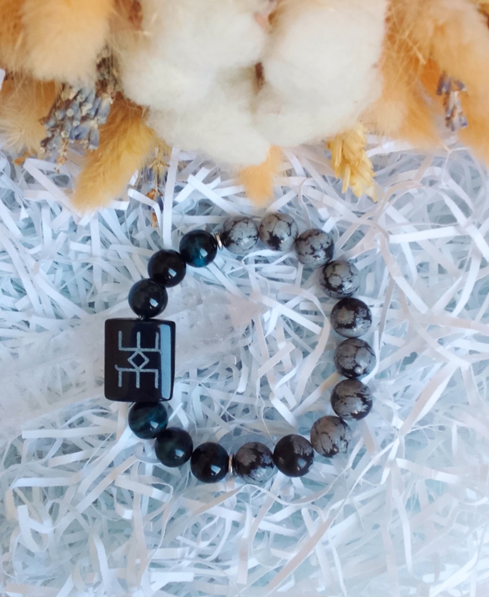 Браслет состоит из натуральных камней соколиного глаза, снежного обсидиана и руны «Помощь» Русская руна «Помощь» содействует человеку, ищущему выход из затруднительной жизненной ситуации, направляет в делах и начинаниях, оберегает от негативных воздействий извне, сохраняет и восстанавливает справедливость. Она вселяет оптимизм и веру в свои силы. «Помощь» способна скорректировать обстоятельства жизни в желательном для практикующего направлении, дать ответы на интересующие его вопросы и привести ситуацию к гармонии и балансу. Руна выстраивает пространство и события таким образом, что какой бы ни представлялась их суть в самом начале, каждое из них в итоге работает на достижение цели человека. Под действием руны «Помощь» человека посещают интересные мысли, неординарные идеи, которые являются знаками, направляющими его движение к осуществлению задуманного. Соколиный глаз помогает обрести интуицию, веру в себя и в свои силы, ясность мышления и уверенность в принятии решений, направляя