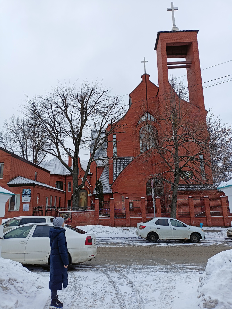 Интересное место попалось нам в центре Твери. Гуляя, натолкнулись на Католический храм. Так странно видеть такое необычное строение, будто ты очутился на улицах Германии. Зайдя внутрь мы вообще потерялись во времени и пространстве. Пустой светлый просторный храм, играет приятная музыка, вокруг ёлочки, украшенные к празднику и декорации из Библии. Атмосфера невероятная, хочется остаться в этом месте. Сидя на лавочке забываешь, что ты находишься в России. Кажется, что сейчас выйдешь из храма и окажешься на улице Кёльна или Мюнхена. Пока мы наслаждались музыкой, несколько раз заходили люди, с восторгом смотрели вокруг, делали фото и уходили. Кто-то, также как мы, присаживался на лавочку, чтобы побыть в этой атмосфере. Задержался еще один мальчик лет 14, который, опустившись на колени, долго о чем-то просил. Было необычно видеть подростка в храме, да еще и в католическом. Уходить совсем не хотелось. Давно я не встречала такого приятного места. И нет там никаких наглых попрошаек, которы