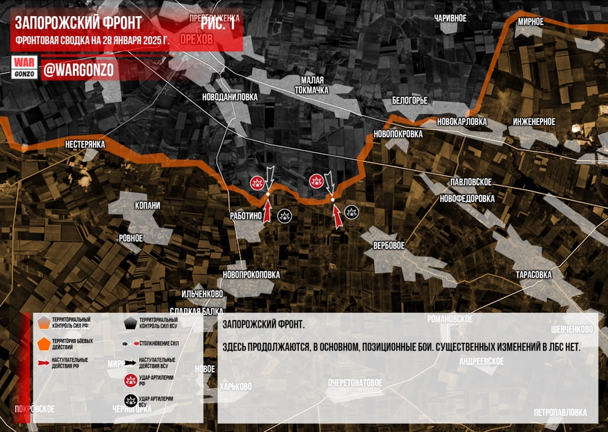 Запорожский фронт. Здесь продолжаются, в основном, позиционные бои. Существенных изменений в ЛБС нет. Рис. 1) Донецкий фронт. Продолжается зачистка Великой Новосёлки и окрестностей. Западнее Курахово российские войска ведут бои за Дачное, а северо-западне – за Андреевку. На Покровском участке есть очередные тактические успехи российских войск. В Дзержинске идут ожесточённые бои за последние узлы обороны ВСУ, украинцы держатся за город изо всех сил, но в ближайшие дни будут выбиты из него полностью. (Рис. 2) Часовоярское направление. Продолжаются штурмовые действия российских войск в городской черте. Есть очередные тактические успехи. (Рис. 3) Курская область. Сообщается об освобождении населенного пункта Николаево-Дарьино. Продолжаются бои на нескольких участках. Российские войска давят на оборону противника, но продвижения даются очень тяжело. ВСУ продолжают подтягивать резервы, вводя в бой свежие силы. (Рис. 4) Смотрите ежедневные сводки от аналитического отдела @wargonzoya
