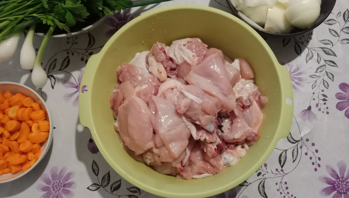 Ингредиенты: Курица – 1 шт. Кабачок – 2 шт. среднего размера Лук репчатый – 3 шт. среднего размера Капуста белокочанная свежая – 1 небольшой кочан Морковь – 2 шт. небольшого размера Укроп, петрушка, зеленый лук – 200 грамм Горошек – можно взять одну банку консервированного, или 300 грамм свежего или замороженного Кукуруза – так же можно взять одну банку консервированной или 300 грамм свежей или замороженной. Вода Соль – по вкусу Перец черный молотый – 1 чайная ложка Кориандр молотый – 1 чайная ложка Масло растительное – 100 мл. Приготовление: Подготавливаем все ингредиенты, моем и очищаем от всего лишнего. Курицу разделываем на небольшие части, лук нарезаем полукольцами, морковь и кабачок нарезаем небольшими кусочками. Капусту назареем средними кусочками, зелень измельчаем. Готовить будем в казане на улице (можно и в казане на плите). Разжигаем огонь, соблюдая всю технику безопасности! Накаливаем казан, вливаем растительное масло (так как все готовится на открытом огне, обжаривается