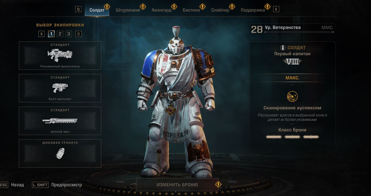 Также стоит отметить что тактик имеет три брони что делает крепким на столько чтобы немного танковать также подсвеченный ауспиком враг танковать не может от слова совсем. Именно этот класс составляет главную огневую мощь вашего отряда. Ближний бой у него тоже на уровне цепной меч как по мне в моем личном топе PVP оружий ближнего боя занимает третье место, от сюда мы имеем крепкую броню, две гранаты и огневую мощь, и способность огрызаться в ближнем бою.