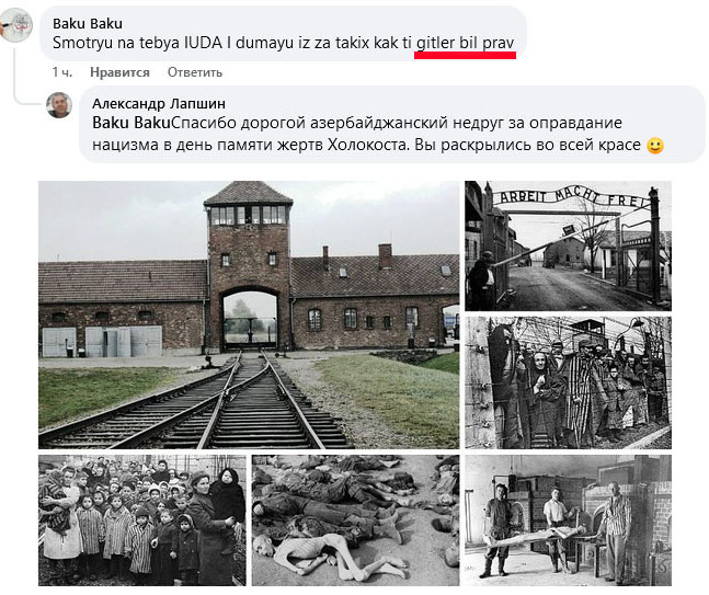 Вчера, 27 января евреи отмечали трагическую дату - День памяти жертв Холокоста. Именно 27 января 1945 года советскими войсками был освобожден нацистский концлагерь Освенцим, где были сожжены в печах около миллиона евреев, включая моих родственников живших в Польше. Вчера мне пришло немало "поздравлений" от азербайджанцев, которые сожалели, что Гитлер не закончил свою работу в отношении евреев, чтобы такие как я не появились на свет. Комментарии азербайджанцев были насколько ужасные и мерзкие (оправдание германского нацизма с бакинским анальным колоритом), что им позавидовали бы даже российские неонацисты которые "зигуют" в электричках и нападают на самих же азербайджанцев из-за цвета их кожи. На самом деле, с фашизмом и антисемитизмом в Азербайджане я сталкивался и лично, будучи там в тюрьме за посещение в качестве журналиста Арцаха (Нагорного Карабаха). Они меня там стабильно называли "грязный джухуд" и что "Эх, жаль фюрер не дожил до наших дней, чтобы решить вопрос с армянскими сепа