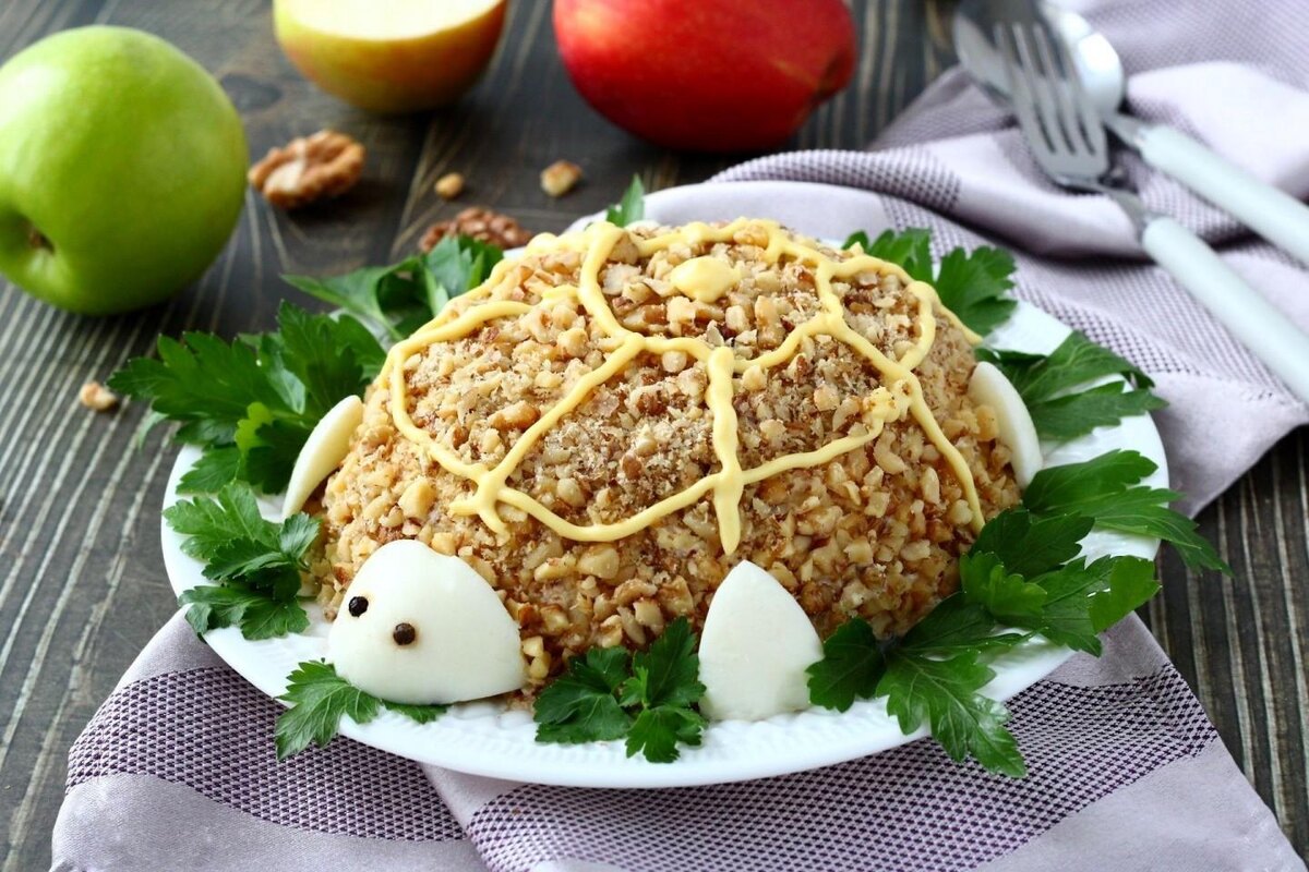 Салат «Черепаха» — это слоёный праздничный салат, который часто готовят на детские дни рождения. Он привлекает внимание необычной подачей и ярким вкусом. Ингредиенты: Приготовление: Куриное филе отварить до готовности, остудить и нарезать небольшими кусочками. Яйца отварить вкрутую, остудить и натереть на крупной тёрке. Яблоки очистить от кожуры и сердцевины, нарезать небольшими кубиками. Сыр натереть на крупной тёрке. Грецкие орехи измельчить. Собрать салат слоями, промазывая каждый слой майонезом: куриное филе, яйца, яблоки, сыр, орехи. Сверху украсить салат половинками грецких орехов, чтобы получилось подобие панциря черепахи. Приятного аппетита!
