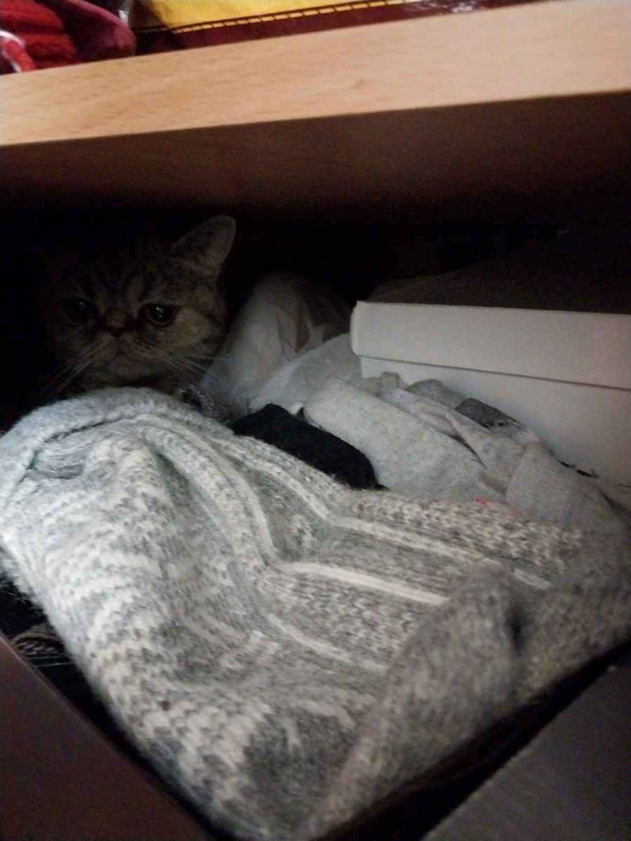 Ваша кошка когда-нибудь терялась в квартире? Наши — постоянно. Просто нужно знать, где искать. Вот, кошка по имени Девочка обожает сидеть в коробке с носками. Хлебом не корми, а дай поваляться в шкафу. А ещё хорошо сдернуть мамину шубу с плечиков, утоптать её хорошенько и взгромоздиться на кучу меха. Ляпота! Была такая история. Оставили мы мамину подругу тётю Таню на хозяйстве, а сами на море уехали. Рассказали все нюансы кошачьих хитростей, но разве все упомнишь? Надо было записывать, как сказала тогда тётушка. Так вот. Утром, как обычно, тётя Таня зашла проверить, как дела у пушистых. Задать корм, воду сменить, лотки... ну, вы знаете. Пересчитала она кошек, а Девочки не хватает. Поискала, позвала — нету кошки, как сквозь землю провалилась! Паника началась, ведь время поджимает, на работу ещё идти надо, благо, что рядом. - Посмотри в шкафу, - сказала мама по телефону. - Так он закрыт! - А ты всё равно посмотри. Открыла тётя Таня шкаф, а из него выходит Девочка. Как она туда попала? Оч