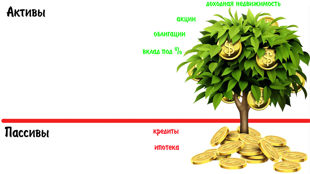 Для начала давайте разберемся, что такое активы и пассивы. Активы - это то, что мы имеем и используем для получения прибыли. К ним относятся: Пассивы - это то, что требует от нас дополнительных расходов. К ним относятся: А теперь давайте попробуем разобраться, к чему относится дом или квартира в которой мы живём и личный автомобиль? На эту тему возникает достаточно много споров кто-то говорит, что "они не приносят доход, а только отнимают деньги на коммунальные платежи и ремонт, следовательно это пассивы", а другие утверждают о том, что они растут в цене, поэтому их можно отнести к активам. Я на этот счёт думаю следующим образом: Представим, что у нас не было бы квартиры и машины, в таком случае, мы бы тратили деньги на найм квартиры и на такси. Следовательно их наличие экономит наши деньги. Поэтому к пассивам отнести сложно, да и тем более нахождение квартиры и машины в одной категории с кредитами мне кажется не уместным. Но и также их сложно отнести к активам которые приносят доход и