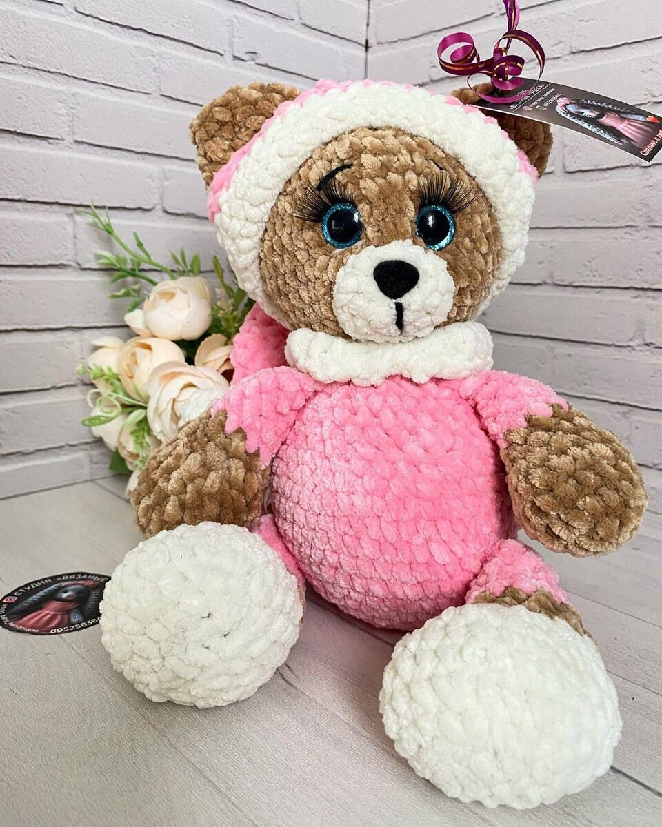 А сейчас я расскажу про "хит сезона". За последние три месяца эту игрушку в разных вариациях я связала 14 раз! В какой-то момент они мне начали сниться, когда я открывала сообщения с заказами - можно было спорить на ящик коньяка что там или заяц, или вот это... Это - Медведик! Как и зайцев, я их вязала в разных костюмах - в пижамах и платьях, в колпаках и беретах, в розовом и в голубом. И даже новогодние были))) А однажды пришел такой заказ - "Хочу такого же медведя, но панду". Причем - панду-девочку. Чем отличается панда-девочка от панды-мальчика в реальности - я, как очень взрослая тетя, конечно же понимаю. Но как они должны отличаться в игрушках? Конечно, бантиком! Розовым. Причем, один комментатор в другой соцсети мне написал; "Для меня панда почему-то всегда априори мужского рода". Наверное, мультик "Кунг-фу Панда" как-то повлиял. Я подумала, что у меня этот меховой мешок с грациозной девушкой тоже не ассоциируется. А у вас?