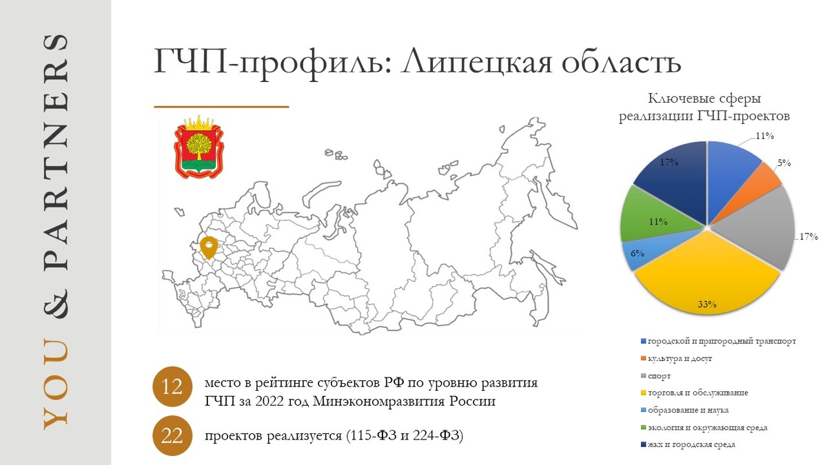 Добрый день, уважаемые коллеги! Место в рейтинге Согласно итоговой оценке рейтинга субъектов РФ по уровню развития ГЧП за 2022 год (Минэкономразвития России), Липецкая область занимает 12 место (поднявшись на 42 позиции по сравнению с 2021 годом). Региональные НПА Среди актов регионального законодательства следует выделить: Распоряжение администрации Липецкой области от 10 октября 2016 г. № 499-р «Об утверждении порядков межведомственного взаимодействия и координации деятельности исполнительных органов государственной власти Липецкой области при подготовке и запуске проектов на основе ГЧП и концессионных соглашений» Распоряжение администрации Липецкой области от 23 декабря 2016 г. № 634-р «Об утверждении порядков контроля за исполнением соглашений о государственно-частном партнерстве и концессионных соглашений, мониторинга их реализации и ведения реестра соглашений о ГЧП» Распоряжение администрации Липецкой области от 14 июля 2017 г. № 278-р «О наделении ОАО «Корпорация Развития Липе