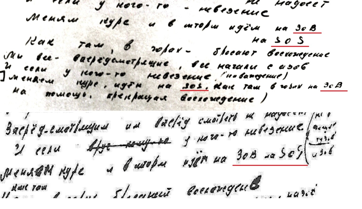 Интересна также попытка передать графически сходство "морских" и "горных" сигналов о помощи в черновиках. Не знаю, есть ли у альпинистов какой-то специальный сигнал для таких случаев. У Высоцкого в этом качестве выступает слово "зов" - он пишет его в одинаковой транскрипции с сигналом SOS, причем оба слова любопытным образом: "ЗоВ" и "SoS".
