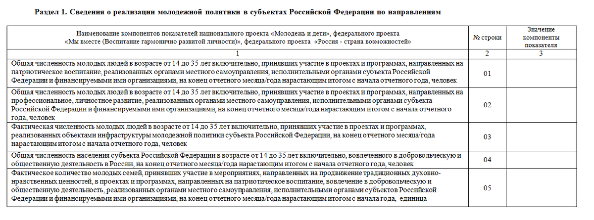 Федеральная статистическая форма № 2-молодежь предназначена для ежемесячного сбора данных о компонентах, входящих в расчет показателей национального проекта "Молодежь и дети".