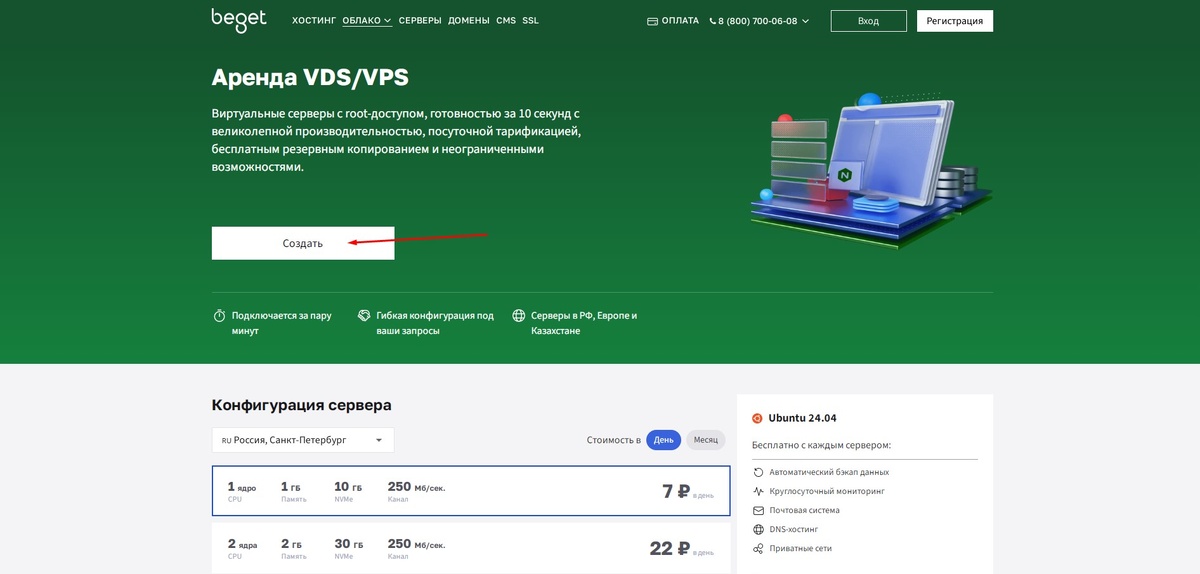 Первым делом регистрируемся по ссылке https://beget.com/p2239517/ru/vps - ссылка реферальная + она ведет именно в тот раздел который нас интересует, при самостоятельной регистрации просто выберете нужный раздел - "Облако".