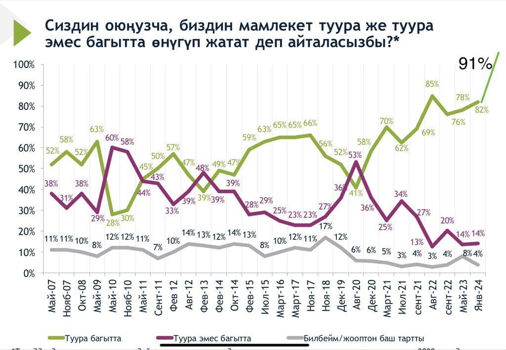 Садыр Жапаровдун Кыргызстандын президенттигине 4 жыл толушу калк арасында оптимизмди жаратты. Сурамжылоолорго караганда, жарандардын 91% өлкө туура жолдо баратат деп эсептесе, анын жеке колдоосу 95%га жеткен. 🎉 Кыргызстанда Садыр Жапарованын президенттигине 4 жыл толду. 📈 Ал жетектеген мезгилде жарандардын оптимисттик деңгээли бир топ жогорулады. АКШнын Эл аралык институтунун сурамжылоосуна ылайык, респонденттердин 91% өлкө туура багытта баратат деп эсептешет. 👍Президенттин өзүн да колдоо көбөйдү: былтыр Жапаровду 88% жарандар колдосо, азыр бул көрсөткүч 95% жетти. Америкалык изилдөөчүлөр мындай көрсөткүчтөрдүн дүйнөлүк лидерлердин арасында теңдеши жок экенин белгилешти. 🌍 Министрлер Кабинетинин Төрагасынын орун басары Эдил Байсалов президенттин жетекчилиги астында мындан аркы ийгиликтерге жана тарыхый өзгөрүүлөргө ишенерин билдирди. ✨ Бул жетишкендиктер Кыргызстандын калкынын маанайында жана бийликке болгон түшүнүгүндөгү оң өзгөрүүлөрдү көрсөтүп турат.