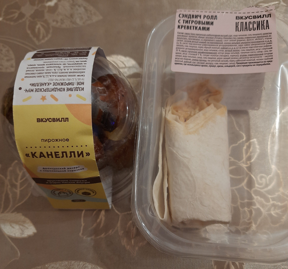 В этот раз нет одного общего фото закупки. Все фотографировала отдельно. По мере дегустирования. - Пирожное «Канелли» 125г за 184р У них очень простой состав. Я люблю такие мало-компонентные, но интересные по текстуре продукты. Состав - молоко пастеризованное м.д.ж. 2,5%, мука пшеничная хлебопекарная высшего сорта, масло сладко-сливочное несоленое м.д.ж. 82,5%, сахар, меланж яичный жидкий Изготовитель ООО Гарден, Московская область, г. Реутов. Пирожные на любителя. Это какое-то странное сочетание хрустящего и одновременно недожаренного оладушка, приторно сладкого, и нежного. Звучит безумно))) Но мне очень понравилось по вкусу))) Для сравнения я пробовала Канелли в ресторане г. Перми (1 шт за 190р) – и было пересушенно и не вкусно. И в этот раз взяла в кофейне. 1 шт – 100р. Она побольше, чем у Вкусвилл. А вот по текстуре – один в один! Так что Канелли из Вкусвилл очень удачные по количеству, вкусу и цене. - Сэндвич ролл с тигровыми креветками 165г за 284р Я такой уже брала недавно. Понр