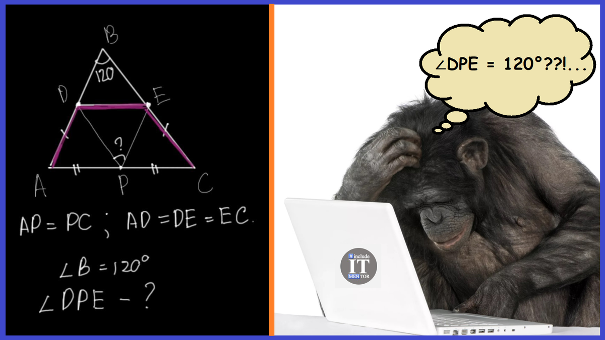 Сегодня один из участников нашего физ-мат telegram-канала Physics.Math.Code предложил интересную задачу. В итоге подвис наш Техночат в размышлениях над ней. Но в итоге решение было найдено. Кто-то пробовал решать задачу через нейросеть или интуицию. Получали ответы в 30°, 75° и 120°. Чуть позже, когда в чате сделали подробные рисунки, мы поняли, что там точно получается прямой угол, но как это доказать... Первое, что мне пришло на ум, так это попробовать результаты теоремы косинусов для треугольников ADP и PEC, чтобы потом их объединить в проверке теоремы Пифагора для треугольника DPE, но это не увенчалось успехом... А сейчас рассмотрим как надо было. Дан произвольный треугольник △ABC. Угол ∠ABC равен 120° градусам. D принадлежит стороне AB. Е принадлежит стороне BC. AD = DE = EC. Точка P - середина основания AC. AP = PC. Найти угол ∠DPE. Для начала сделаем рисунок, который будет больше похож на заданные величины углов и расстояний в нашей задаче: Здесь же мы введем некоторые обозначен