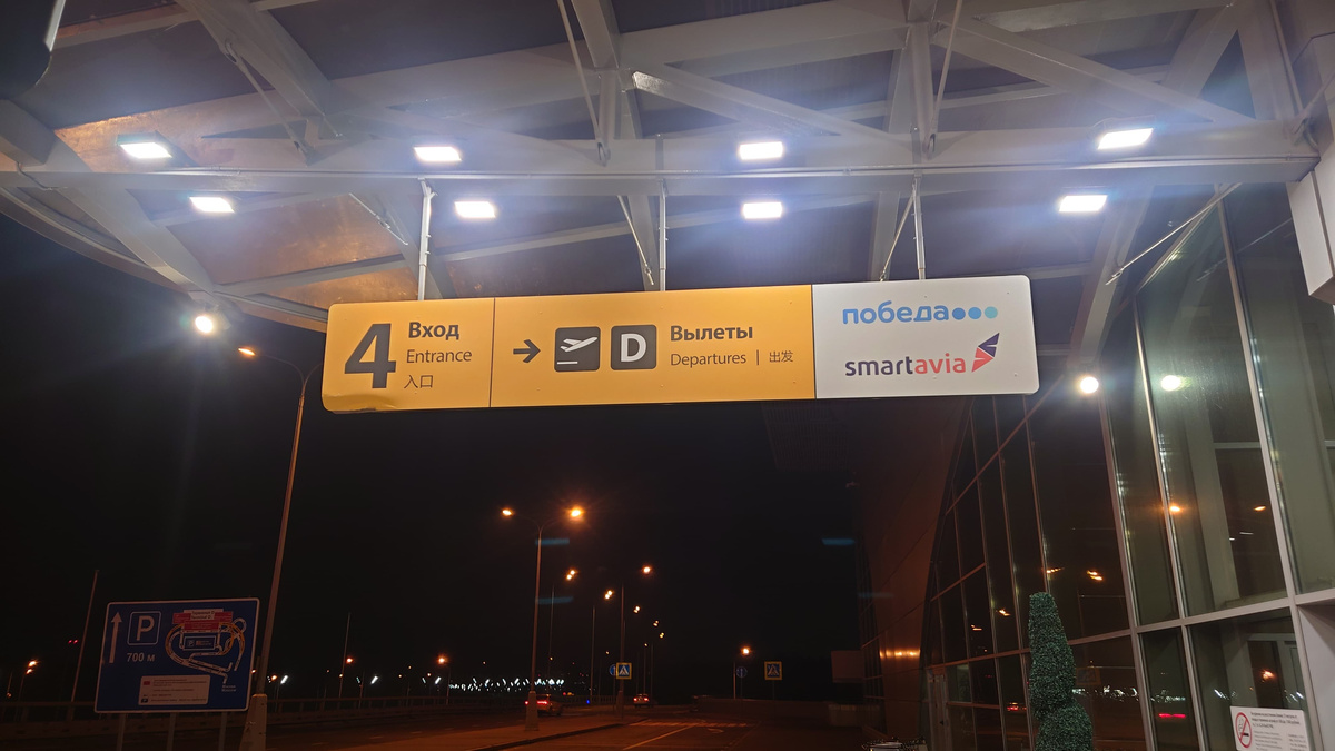 Именно первая точка досмотра перед входом в здание терминала становится в последнее время камнем преткновения для пассажиров. Один из "продвинутых" читателей моей первой статьи поделился лайфхаком в комментариях и подсказал, каким образом он поступает, когда хочет избежать толпы пассажиров на первой точке досмотра. Большая благодарность этому читателю за столь полезный совет! Я решил проверить этот лайфхак на собственном опыте. Заказал такси не в нужный мне международный терминал С, а в терминал D, в котором обслуживаются на текущий момент рейсы всего двух авиакомпаний - Победа и Смартавиа. Доступ в терминал был открыт только через один единственный вход, а именно с номером 4.