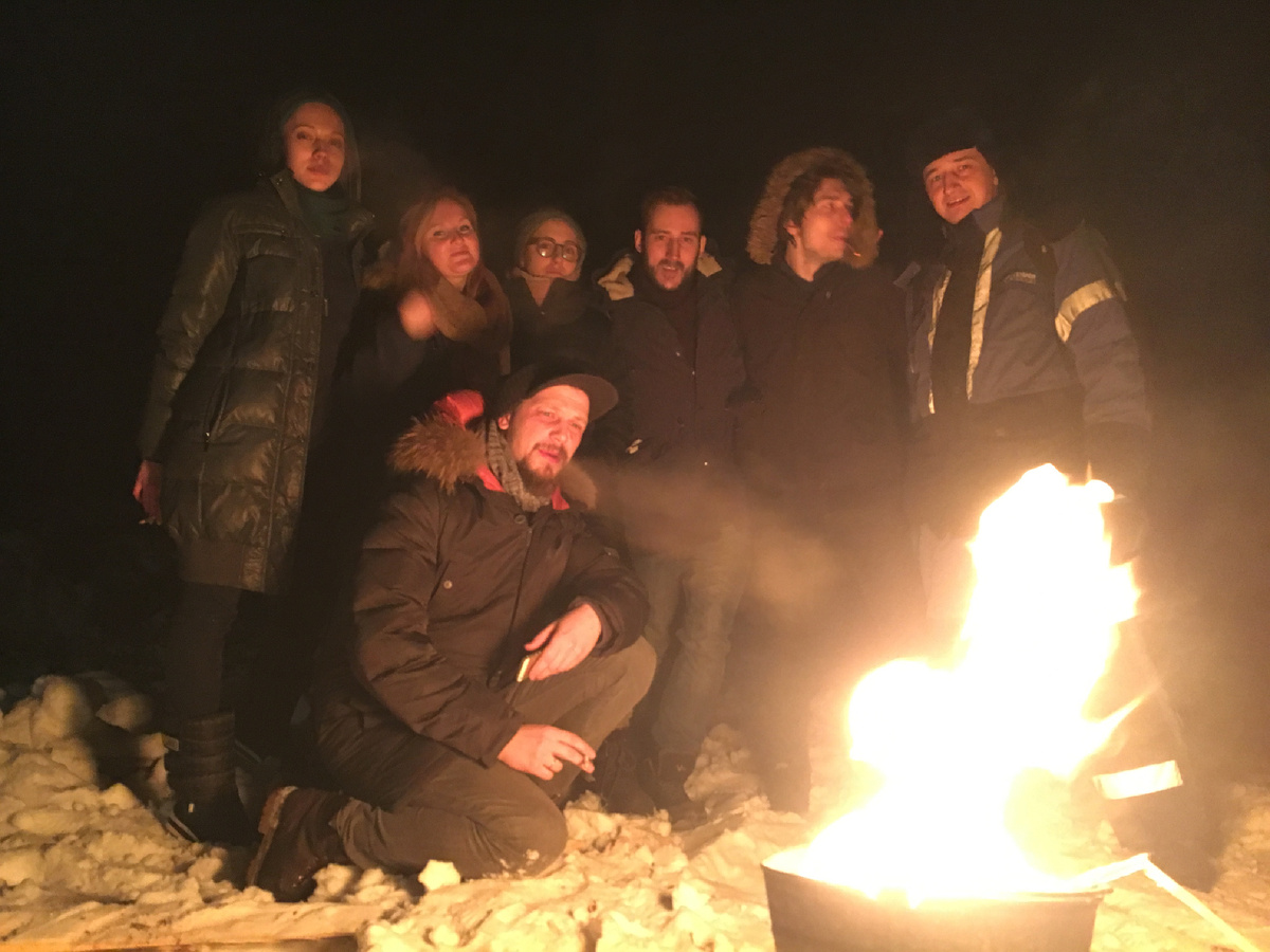 Мы сожгли штаны! Нет, ну сначала мы конечно продолжительное время снимали их в кино на мне, а потом сожгли. Вот, сидим греемся у них. Дело в том, что мы закончили съёмки и это последний день! А штаны ещё и порвались немножко. А мы ещё и замёрзли как следует… Всё, шло к тому, чтобы это случилось! Красивое кино получилось! Зима, деревня в лесу. Деревянная изба и один городской житель в ней, прячущийся от городской суеты. Прекрасная команда, потрясающие люди, часть из которых можно увидеть у костра. А вот наш режиссёр. Эт мы, стоим, смотрим с ним в светлое будущее. И вот перед тем, как совершить акт публичного сожжения штанов, я несколько раз спросил у режиссёра, нужны ли они? На что он несколько раз ответил - Уже нет!.. Решено! Без возврата! Сжечь!… А утром, позвонил и говорит: - Я тут решил кое-что доснять, ты же не сжёг штаны?... В ответ я отправил ему первое фото... А на самом деле, любые продолжительные съёмки, это возникновение некого химического процесса, если можно так