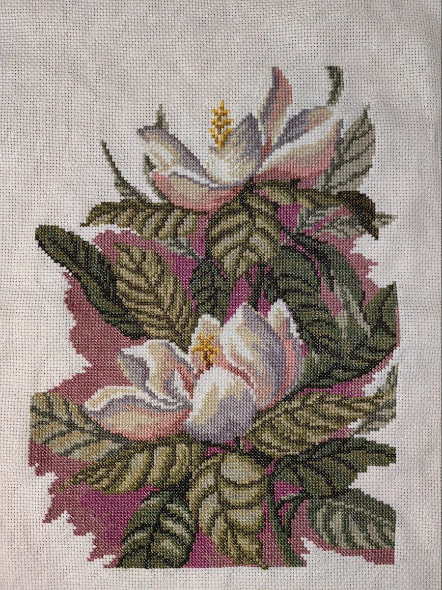 Сейчас у меня в процессе оформления еще 2 недавние работы, а пока руки дошли наконец-то поставить уже финишную точку в этой. Закончила я ее уже достаточно давно. Но был свой нюанс. По схеме предполагалось, что будет полная зашивка фона. Мне это показалось крайне утомительным. Думаю, что мало кому понравится вышивать одним цветом монотонный фон. И я решила не делать его. По итогу получилась вот такая картина: В целом сам результат меня устраивал, единственно, вызывал сомнение верхний участок, так как цветок сливался с фоном. По-хорошему, перед стартом нужно было задуматься о другом цвете канвы, но, как говорится, хорошая мысля приходит, сами знаете когда. Итак, вышивка готова в таком виде, рамка заказана, получена и благополучно лежит дома. Но я уже начала новый процесс, и поэтому, пока не горел глаз заканчивать этот. После финиша с натюрмортом, я все же решила хоть как-то собраться и доделать эту работу, чтобы не отвлекаться от нее и идти дальше. В итоге частично сделала окантовку ве