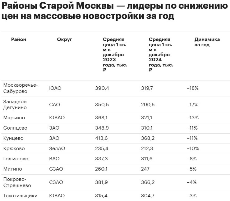 Топ-10 районов «старой» Москвы с самой подешевевшей первичкой за прошедший год.
