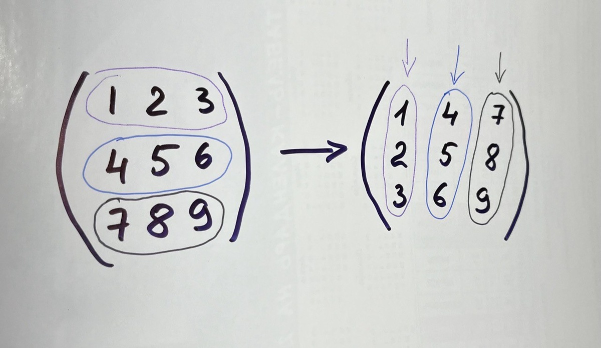 Транспонирование матрицы - это процесс замены строк матрицы на столбцы с тем же номером и порядком элементов. А теперь простым языком: для транспонирования нужно каждую строку последовательно записать в новой матрице в качестве столбца. Примерно это выглядит так: Специально в матрице все числа даны разные, чтобы было понятно, какой элемент на какое место встаёт. Транспонированная матрица обозначается следующим образом: Ни в коем случае не путаем такую запись с возведением в степень. Запишем транспонирование матрицы в математическом виде: По поводу транспонирования матриц стоит указать ещё на следующие свойства. Транспонирование транспонированной матрицы (простите за тавтологию) приводит нас к начальной матрице. Немного заумно, но запишем в математическом виде и всё станет понятно: Следующее. Произведение числа на транспонированную матрицу можно представить как транспонирование произведения этого числа на транспонированную матрицу. Снова запишем в математических обозначениях, чтобы стал