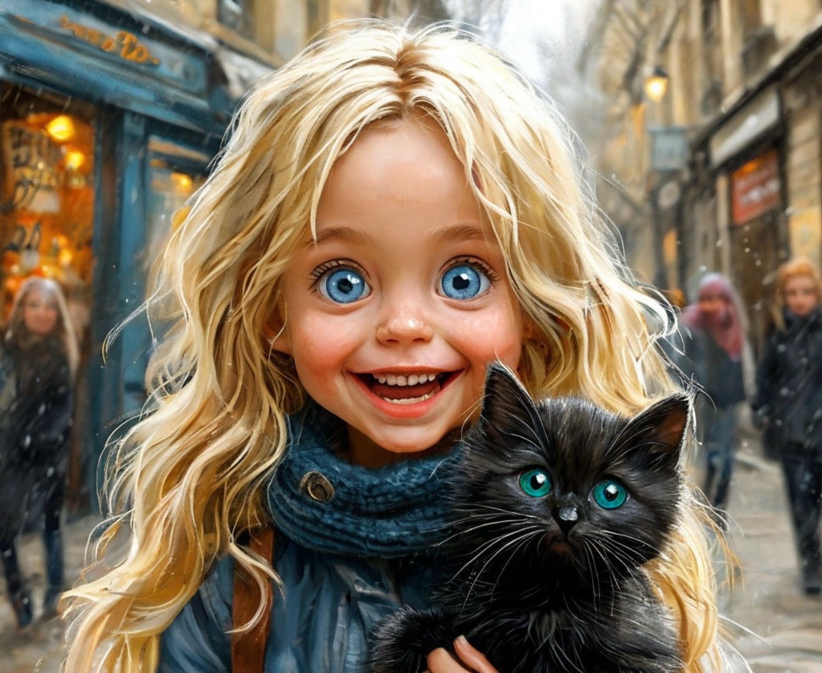 В маленьком городке жила-была девочка Марина. Ей было всего три года, но она уже была очень любознательной и смелой. У Марины были светлые волосы и большие голубые глаза, которые всегда светились от радости. Однажды, гуляя во дворе, она заметила черного котенка, который выглядел очень грустным и одиноким. Марина решила подойти к нему и познакомиться. Котенок оказался очень дружелюбным и сразу же полюбил девочку.