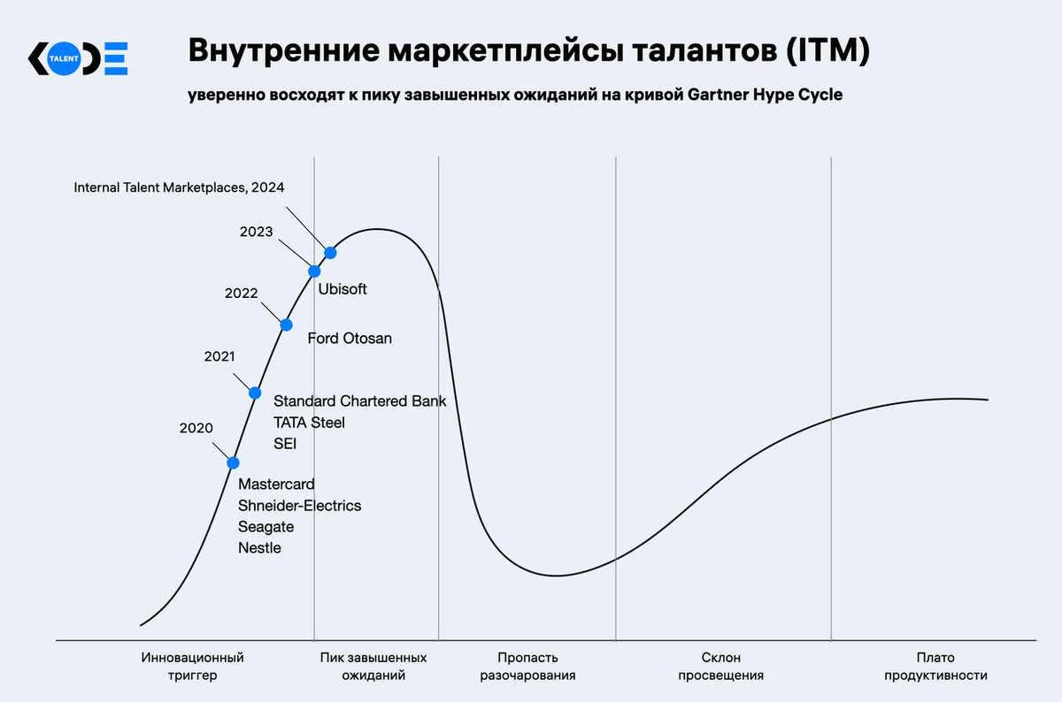 Внутренние маркетплейсы талантов уверенно набирают популярность и восходят к пику завышенных ожиданий. На западе волна внедрений совпала с периодом пандемии COVID-19. Изменение позиций на Hype Cycle и годы внедрения разными команиями можно увидеть на картинке. Внутренний маркетплейс талантов (Internal Talent Marketplace) — это система, используемая внутри организаций для управления и распределения внутренних ресурсов: способностей и навыков сотрудников. Система учитывает и состыковывает 2 стороны: потребности организации (в лице руководителей разного уровня) и сотрудников. Маркетплейс может быть разной степени сложности, но обычно предполагает цифровую платформу для реализации нужного функционала. Вот основные тренды, которые привели к этой технологии.