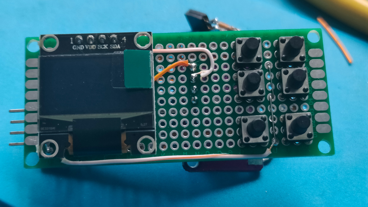 Шесть кнопок - шесть проводов. Цвета проводов чередуются. Оранжевые - крайняя колонка кнопок, белые - средняя. Дальний белый провод - это питание на OLED-дисплей. Его не трогаем!