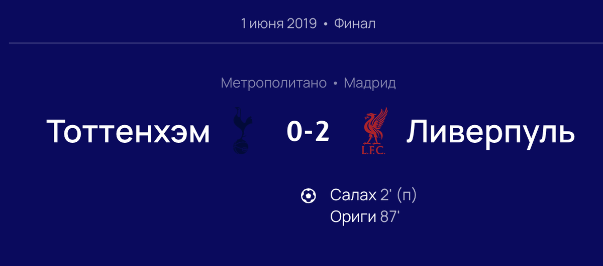 «Ливерпуль» — «Тоттенхэм Хотспур» (2:0) Этот финал стал особенным, потому что обе команды сотворили чудо на пути к решающему матчу. «Ливерпуль» совершил легендарный камбэк в полуфинале против «Барселоны», разгромив каталонцев 4:0 после поражения 0:3 в первом матче. А «Тоттенхэм» благодаря невероятной воле к победе обыграл «Аякс» на последних минутах. Финал был напряженным: уже на второй минуте Мохамед Салах реализовал пенальти, что задало тон матчу. Хотя «Тоттенхэм» пытался вернуть контроль, «Ливерпуль» показал свою силу и удвоил преимущество благода