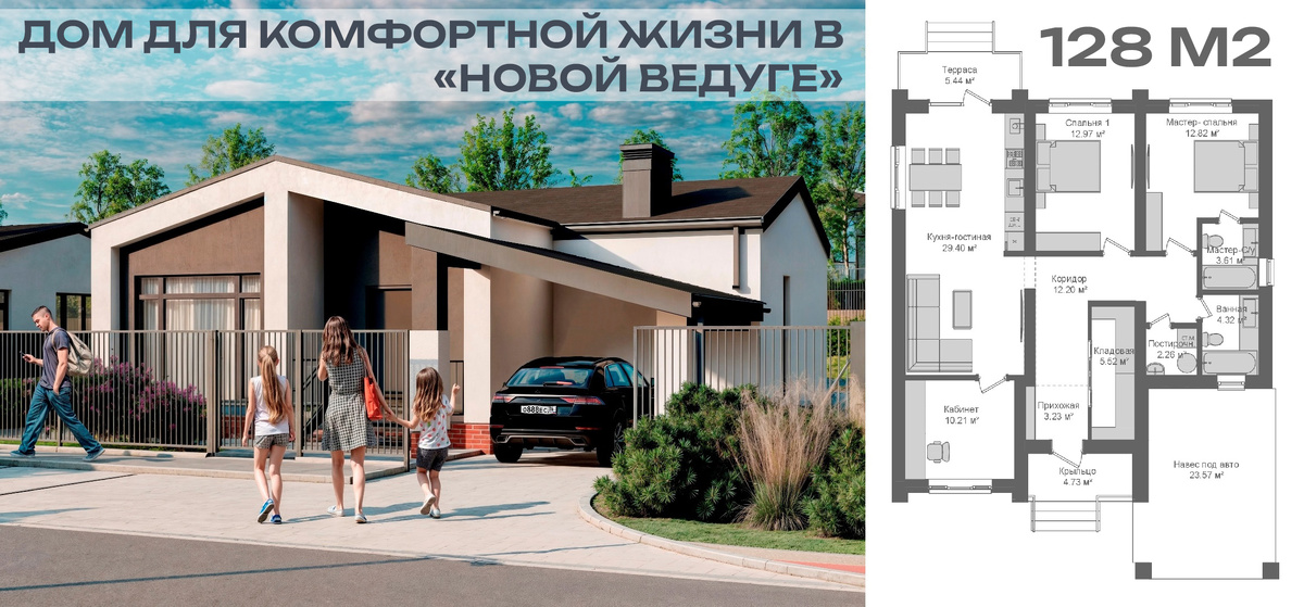 Дом для комфортной жизни в «Новой Ведуге» Представляем современный одноэтажный дом площадью 128 м², который объединяет функциональность, уют и стиль. Он идеально подходит для семей из 3–4 человек, а его продуманная планировка создаёт идеальные условия для жизни, работы и отдыха. Ключевые преимущества дома: ✔ Просторная кухня-гостиная (29,4 м²) – это сердце дома, где вы сможете собираться с семьёй и друзьями. Выход на террасу (5,44 м²) позволяет наслаждаться утренним кофе или тёплыми вечерами на свежем воздухе. ✔ Две спальни (12,97 м² и 12,82 м²) расположены в приватной зоне, обеспечивая комфорт и спокойствие. Мастер-спальня имеет отдельный санузел (3,61 м²), создавая личное пространство для хозяев. ✔ Отдельный кабинет (10,21 м²) – идеальное место для удалённой работы, хобби или дополнительной спальни. ✔ Функциональная кладовая (5,52 м²) и постирочная (2,26 м²) освобождают жилое пространство от бытовых забот. ✔ Навес для авто (23,57 м²) защищает вашу машину от осадков. ✔ Энергоэффектив