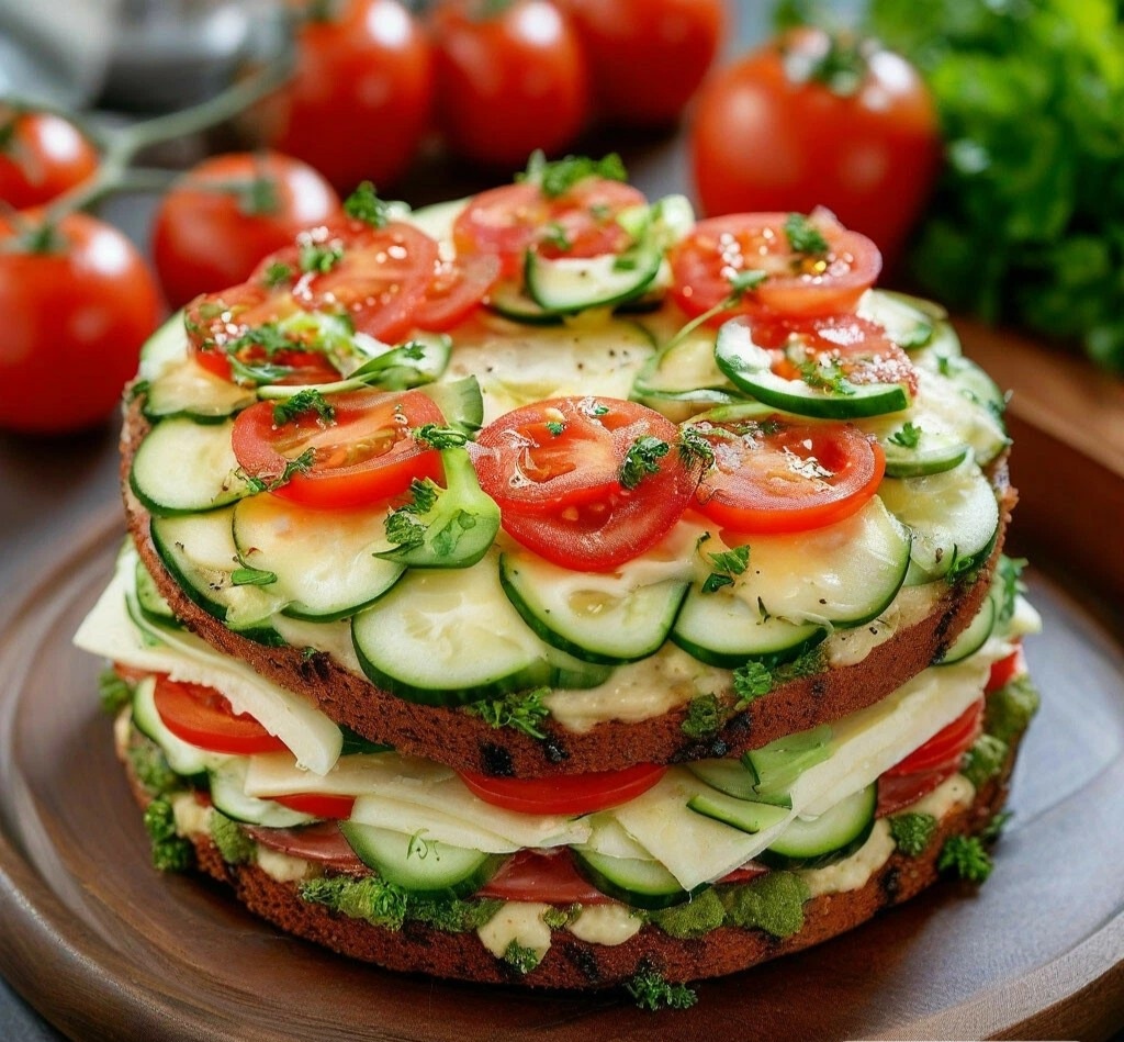 Для теста: 3 стакана муки, 200г масла, 200г сметаны, 1 неполная чайная ложка соли. Для начинки: 300г масла, 150г ветчины, 2 чайные ложки горчицы, 400г печёночного паштета или ливерной колбасы высшего сорта, 150г сыра швейцарского, 4 яйца, 1 ст. ложка рубленого зелёного лука, 2 ст. ложки рубленой зелени петрушки, 3 огурца свежих или солёных, 2 помидора свежих, 150г колбасы телячьей, 1 луковица, 1 столовая ложка майонеза, соль и перец по вкусу. Замесить тесто: порубить муку с маслом для получения как бы маслянистой крупы, влить сметану смешанную с одной чайной ложкой соды, быстро замесить тесто и поставить в холодильник на 20 минут на холод, раскатать и испечь в круглой посуде пять одинаковых коржей. Приготовить начинки: 1) растереть 2 ст. ложки сливочного масла до консистенции сметаны, добавить 1 ст. ложку майонеза, 1 ст. ложку рубленной зелени