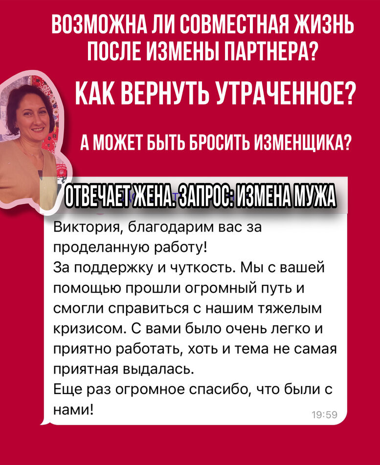 На что в паре влияют откровения «слабого пола»? Для иллюстрации прикладываю добровольный отклик супруги о совместной работе с партнером, который изменил ей, но пожелал обратиться к семейной терапии за психологической помощью. Это факт, что благодаря женской чувствительности и восприимчивости, открытости в диалоге мужчине легче понимать, что происходит с их отношениями. На примере пары из отклика, где не обсуждались сексуальные потребности и предпочтения, и за годы жизни из это привело к взаимному неудовлетворению и изменам в разных треугольниках отношений. Если женщина говорит о том, что ей нравится или что ее ранит, оскорбляет, это «зеркалит» мужчине что надо или не надо делать, если он хочет БЫТЬ ГЛАВНЫМ ГЕРОЕМ романа его любимой. Как для психолога, мне важно активизировать пару на взаимное доверие и готовность проговаривать в диалоге не только, что происходит сейчас, или умело разбирать прошлое, а и об совместных перспективах семьи! От общего идем к частному, и получаем на индивидуа