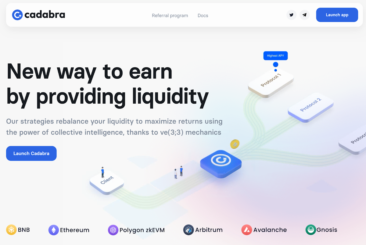 - Возможность кросс-чейна для максимизации прибыли. В отличие от конкурентов, многие из которых ограничены одной сетью, Cadabra поддерживает взаимодействие с большинством популярных сетей: BNB, Ethereum, Polygon zkEVM, Arbitrum, Avalanche и Gnosis. Это позволяет пользователям извлекать максимальную прибыль без сложных переходов.