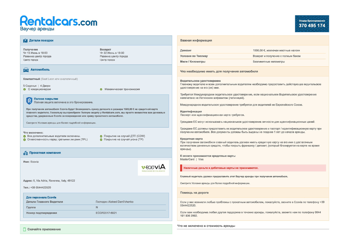 Напомню предысторию аренды авто, поиски которого начались за месяц до поездки в Италию. Выбор остановил на на Seat Leon 1.6 с МКПП на бензине, поскольку на него была очень хорошая скидка и стоимость аренды авто на 7 дней составила 10 226,76 руб., плюс добавил полную защиту (аналог нашего КАСКО) авто, которая обошлась еще в 5 661 руб., итоговая стоимость аренды составила 15 888 руб. (на тот момент курс рубля к евро был около 75). Были варианты взять что-то типа Fiat или Smart (сэкономив ещё немного кэша ;)), но мне они показались слишком маленькими для продолжительных путешествий. Таким образом, за месяц до вылета был забронирован Seat Leon 1.6 с МКПП на бензине, сроком на 7 дней (неделю), в прокатной компании EcoVia без внесения каких либо авансовых платежей. На почту получил ваучер аренды, который перед поездкой распечатал. Для аренды авто необходимо водительское удостоверение (ВУ), российские права вполне себе подходят, загран паспорт, банковская карточка, на которой должно находит