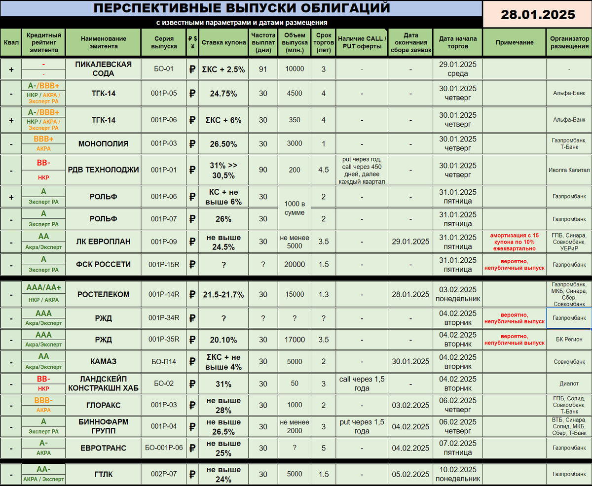 🐯 Дорогие друзья, время новостей! Без них сегодня не обошлось, готов вам представить :) ---------- 🆕 НОВЫЕ РАЗМЕЩЕНИЯ / АНОНСЫ: ❄️ РДВ ТЕХНОЛОДЖИ (🅱️🅱️➖) предпринимает вторую попытку штурма долгового рынка, но краше выпуск не стал. На сей раз старт торгов намечен на 30 января, параметры остались неизменны, но напомню их кратко: 200 миллионов рублей, 4 года торгов, но с кучей условий: пут-оферта с пересмотром купона через год, а через 1,5 года эмитент получит возможность каждый квартал погасить выпуск по номиналу (call). До оферты определены 4 квартальных купона: 1 и 2: 31%, 3 и 4: 30,5%. Участие в первичке потребует согласования организатора размещения (Иволга Капитал). ❄️ ЛАНДСКЕЙП КОНСТРАКШН ХАБ (🅱️🅱️➖) анонсирует второй выпуск БО-02. Параметры ничем не отличаются от первого: те же 50 миллионов рублей, 3 года торгов, call через 1,5 года, ежемесячные выплаты. Идентична и ставка купона - 31% на весь срок торгов. Организатор размещения - Диалот, начало торгов - 4 февраля. Деб
