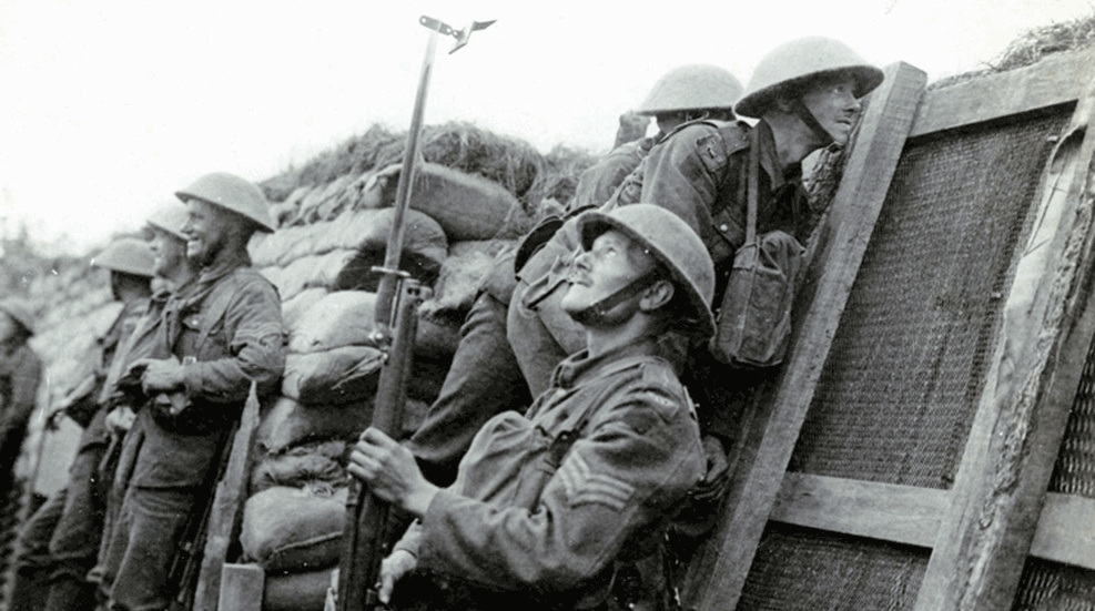 «Томми» использует маленькое зеркальце, вмонтированное под углом в металлическую рамку, которая закреплена на штыке его винтовки Ли-Энфилд, для относительно безопасного наблюдения за «ничейной» полосой.