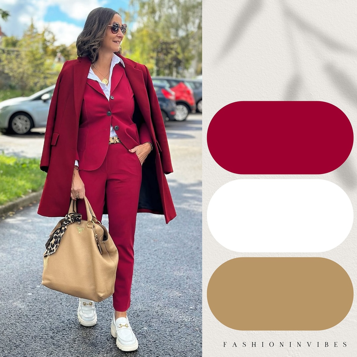 Базовый серый + белый + рубиновый – сдержанное и при этом запоминающееся комби на разные случаи жизни.