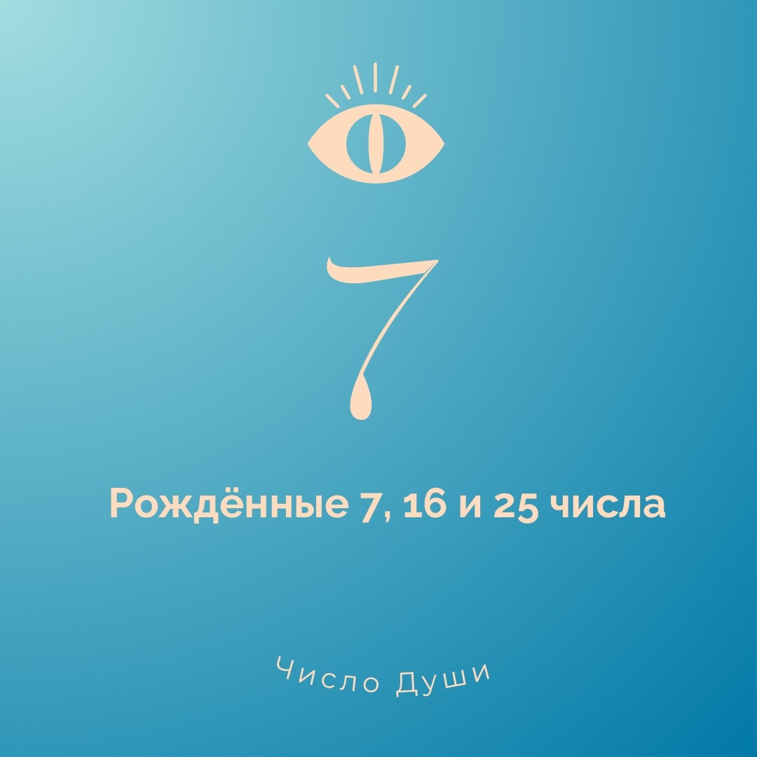 Сегодня как раз вторник, и это день южного узла Кету, который курирует людей рожденных 7, 16 и 25 числа (правда, в некоторых источниках, можно найти, что понедельник день семерок) - ваше Число Души - 7 Цвет: белый, голубой, светло-зеленый, нужно избегать черного Камни: кошачий глаз или бирюза Все, что будет здесь звучать, очень общая информация. Нумерология – это как один из инструментов самопознания, и его необходимо использовать в комплексе с другими дисциплинами. Плюс, в источниках говорится, что с 36-38 лет на характер человека начинает больше влиять Число Судьбы. А я бы смотрела сразу еще и в натальную карту – в ней видны как раз индивидуальные особенности, и на самого человека с его контекстом жизни. Но, так или иначе товарищи, имеющие число Души – 7 очень необычные: отличные интуиты, обладающие экстрасенсорными и целительными способностями, мудрые, хорошие психологи, считывающие окружение как открытую книгу (им бесполезно врать), при этом сами очень загадочны и создающие большую
