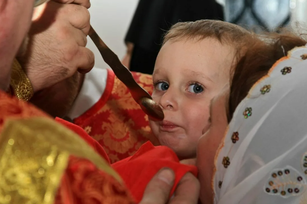 Один из эпизодов Евангелия повествует о том, как к Спасителю приносили детей, чтобы Он благословил их прикосновением. Тогда апостолы пытались не допустить родителей и их детей к Христу. Но Господь вознегодовал и изрек заповедь: «...пустите детей приходить ко Мне и не препятствуйте им, ибо таковых есть Царствие Божие...». Потом Иисус обнял детей, благословил их и возложил на них руки. Но детям из этого эпизода на тот момент посчастливилось не так сильно, как всем тем детям, которые жили и живут после Вознесения Господня, потому что последние имеют возможность причащаться Тела и Крови Христовых. Благословение Спасителя подается через благословение любого священнослужителя, а соединение с Христом возможно только через вкушение Святых Тайн. Главное условие для причащения детей состоит в том, что мальчик или девочка должны быть крещеными. Для детей возрастом от одного до трех лет не предусмотрено никакой подготовки к причастию – перед службой их можно и нужно покормить. Малыша, который уже