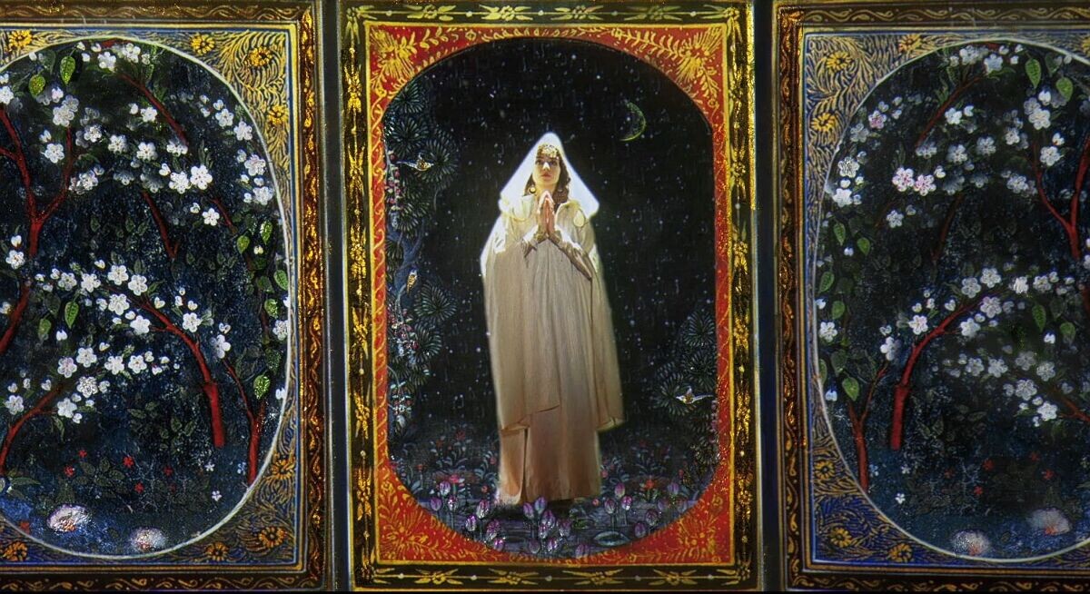 Я заметила, что в трагичной истории двух молодожен звук чтения поэмы идет на двух разных языках - русском и одном из восточных языков, предположительно ливанском. Меня удивило, что родной этим героям язык отдается эхом - создавая будто бы двухмерную атмосферу. Как писал Хдебников, в этих возлюбленных соединились два мира в одном, как звезды - восточная и западная. Разрыв невестки и жениха сопровождался тотальной тишиной, ощущалась большая пустота, как пропасть между ними. В один момент многообразие звуков резко пропало - образовав некий пробел. Сочувствие к героям появилось в ту же секунду. Подобных историй о разлуки влюбленных в культуре и мифологии много и будто они уже не ощущаются как что-то новое, однако эту историю изобразили абсолютно по-другому - чувственно. Как я уже писала ранее, этот эпизод больше чувствуешь, чем анализируешь - в принципе, как и весь фильм. Метафоричность двух разных языков, звучащих в одно время имеет большой смысл. Думаю, здесь поэт и режиссер отсылались на сплетения двух разных культур - западную и восточную. Будто не смотря на исторические и культурные различия - история любви будет понятой каждым человеком, потому что любовь - это чувство, которое протекает не на одном из существующих языков. Мифология востока выступает метафорой западном миру, чтобы посмотреть на ту или иную вещь под двумя разными культурными углами - что дает пространство для восприятия куда больше, нежели язык строго одной культуры.