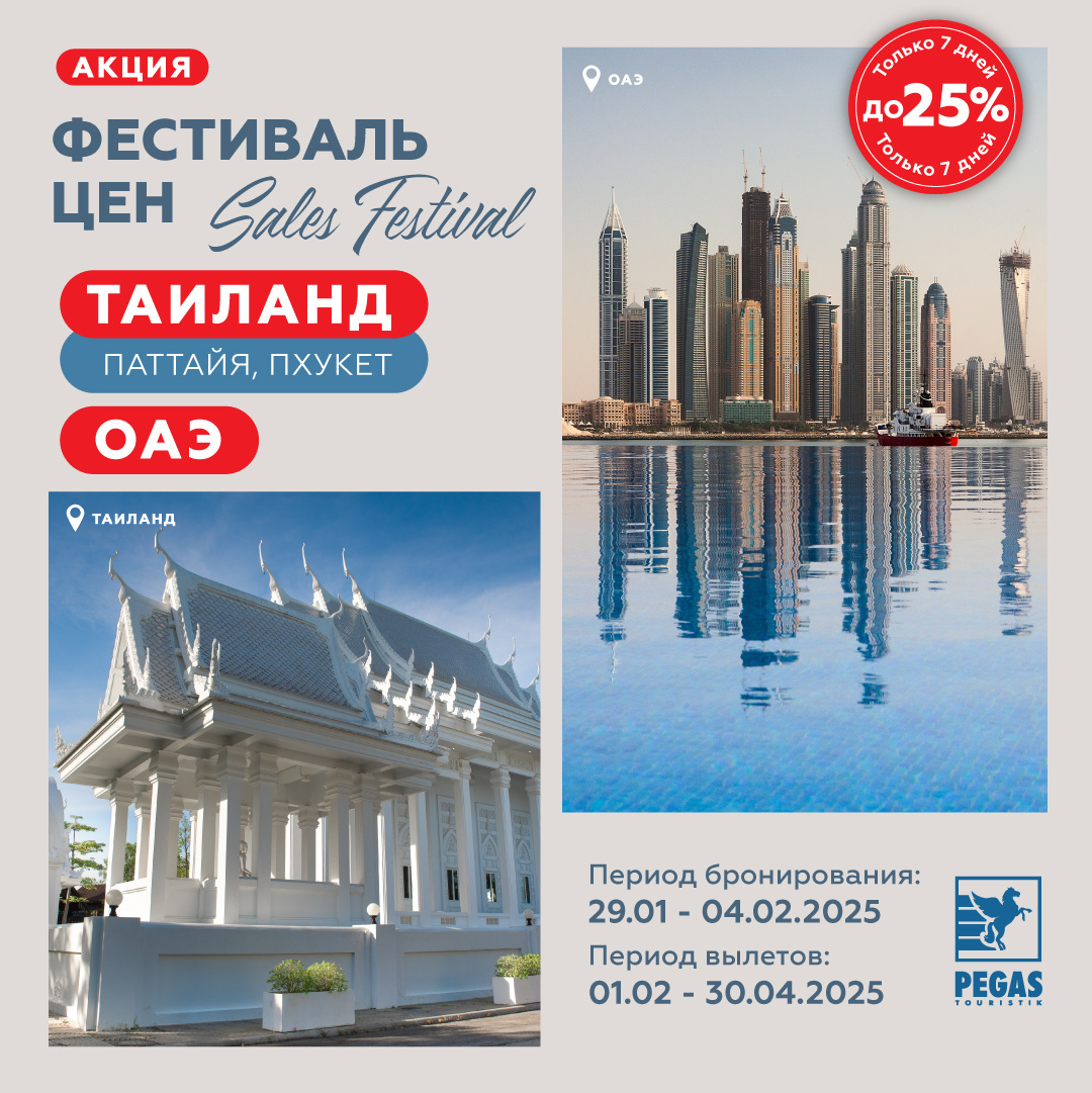 🛎️Дорогие друзья! Рады анонсировать предложения по Таиланду и ОАЭ со скидкой до 25%! АКЦИЯ ФЕСТИВАЛЬ ЦЕН: 🇹🇭ТАИЛАНД: 💙Паттайя: Барнаул, Благовещенск, Владивосток, Екатеринбург, Иркутск, Красноярск, Новокузнецк, Новосибирск, Томск, Хабаровск 🔎Посмотреть туры: https://vk.cc/cHX4TV 💙Пхукет: Екатеринбург, Иркутск, Казань, Красноярск, Москва, Новосибирск, Пермь, Санкт-Петербург, Самара, Уфа, Хабаровск, Челябинск, Чита 🔎Посмотреть туры: https://vk.cc/cHX53Z 🇦🇪ОАЭ: Шарджа: Екатеринбург, Казань, Москва, Самара, Уфа 🔎Посмотреть туры: https://vk.cc/cHX5dK ☝️Акционные условия не распространяются на туры: Hotel only, Ticket only и туры на основе GDS. 💜Туры по Акции отмечены в поиске туров на сайте иконкой Sales Festival. Вся дополнительная информация на нашем сайте pegast.ru💙