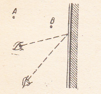 ЗАДАЧА 1. Перед вертикальным плоским зеркалом расположены два маленьких шарика А и В. Что увидит наблюдатель, рассматривая изображения этих шариков в зеркале при различных положениях глаза? Как наблюдатель должен расположить глаз, чтобы изображения шариков накладывались друг на друга?